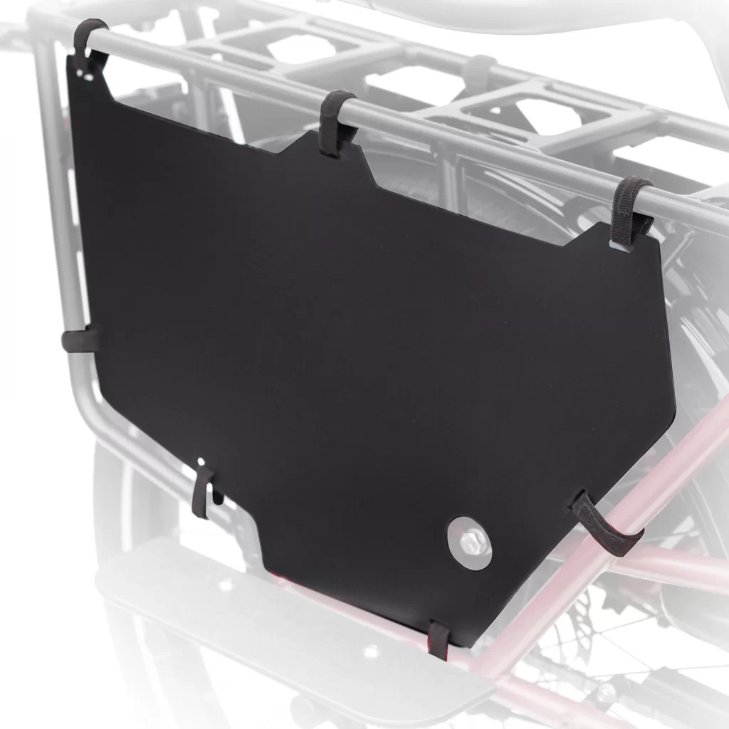 Les pare-jupes pour ÉVO longtail sont constitués d’une plaque en polypropylène et fixés à l’aide de bandes Velcro repositionnables.