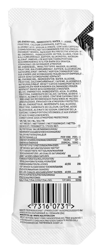 Notre corps peut utiliser jusqu’à 60 grammes de carbohydrates par heure sous forme de glucose ou de maltodextrine (polymère de glucose). En utilisant une combinaison de fructose et de glucose/maltodextrine, on peut consommer jusqu’à 90 grammes de glucides par heure. Les études scientifiques récentes ont prouvé qu’en augmentant la quantité de fructose, un ratio de 0,5:1 permet d’augmenter encore plus la prise de glucides. Le GEL 100 CAF 100 contient un ratio fructose/glucose 0,8:1. Une portion contient 25 grammes de carbohydrates.